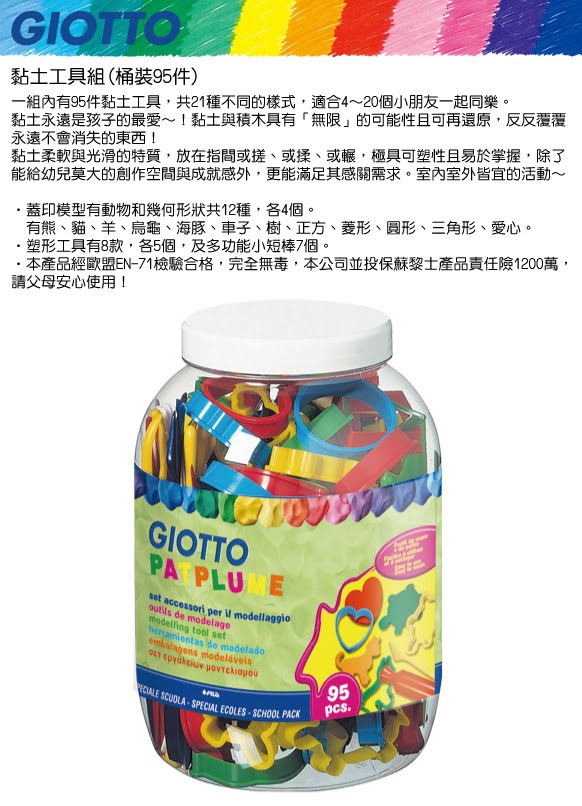 網路購物EC是擋不住的趨勢,可以方便比價只要用功通常都能買到相對便宜的商品!整理了GOOGLE上關於【義大利 GIOTTO】689000 黏土工具組 (95pcs桶裝) /組搜尋前幾名排序的資料來輔助!售價隨時會調整;特價有時效性,有需要的人動作要快!雅虎購物、momo購物及博客來是我比較常去逛的EC網購平台,常常有優惠商品可撿便宜。網路價格隨時會調整,請以原網購平台資料為準!